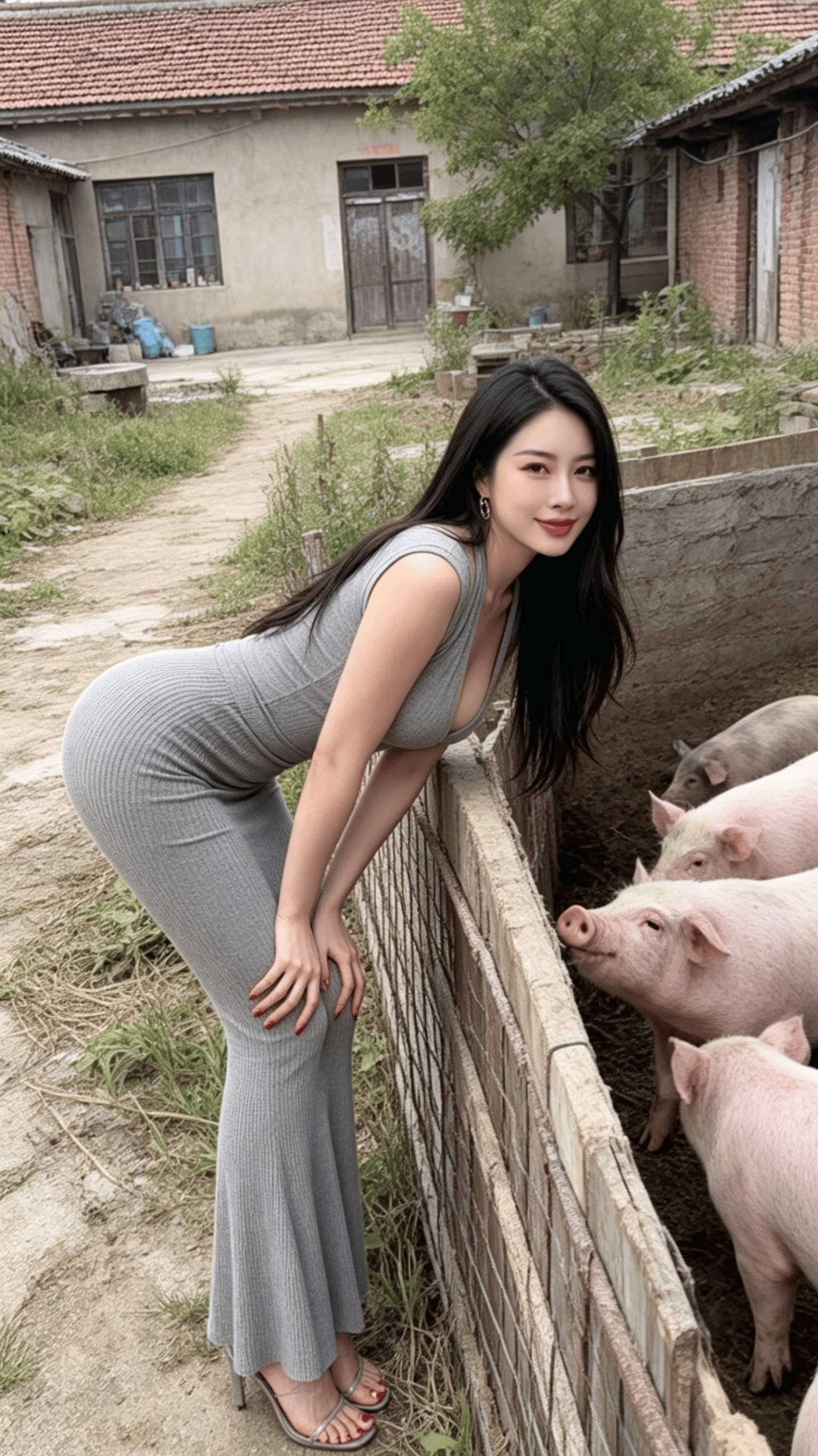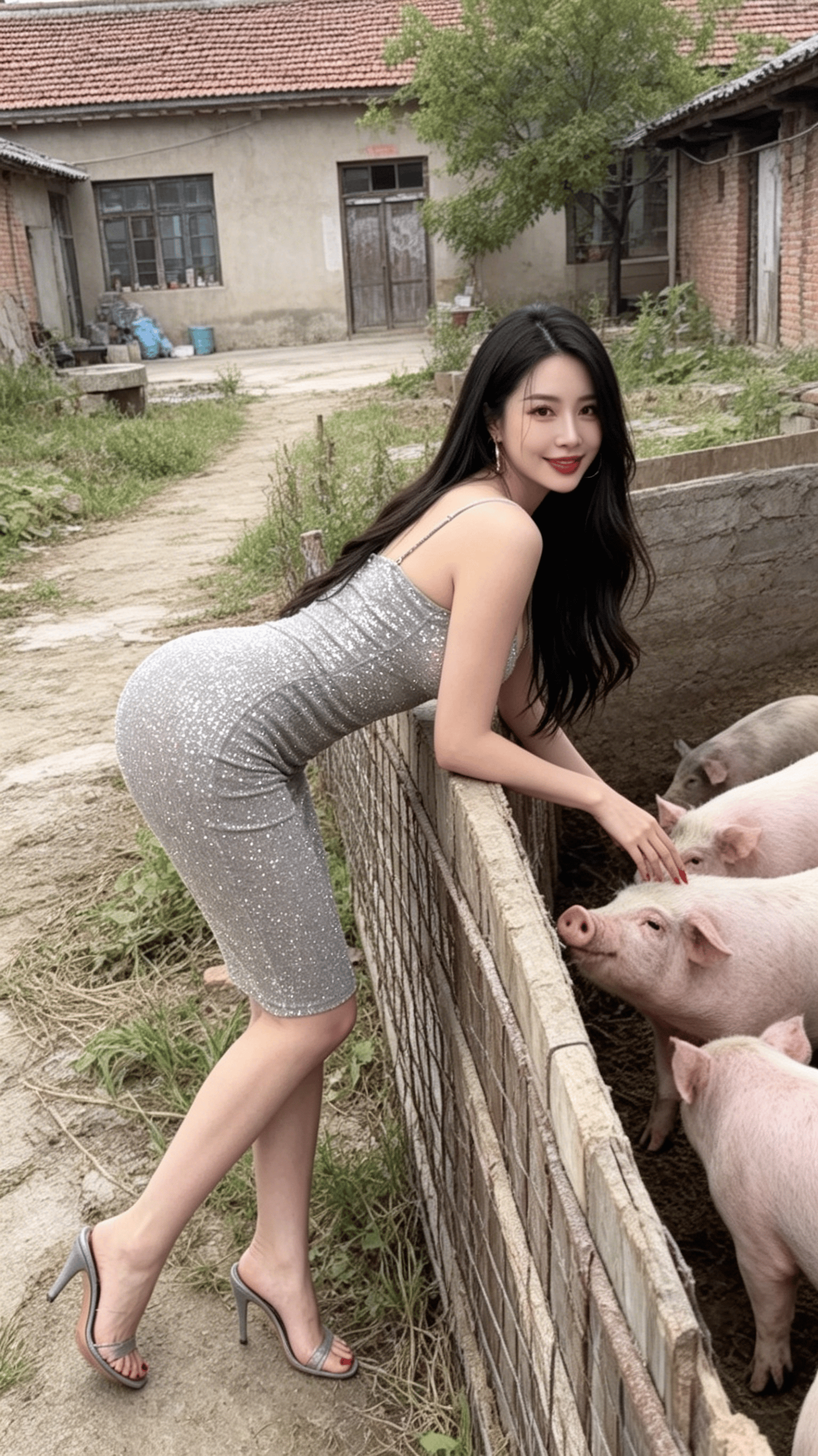 红得发亮的指甲搭在粗糙的木栏上,红唇弯着漫不经心的笑,连圈里的小猪都凑过来,拱她垂下来的蕾丝边。风卷着泥土和青草的味道吹过来,她的黑长直扫过肩颈,蕾丝的影子落在黄土地上,比城里任何网红打卡点的灯光都勾人。